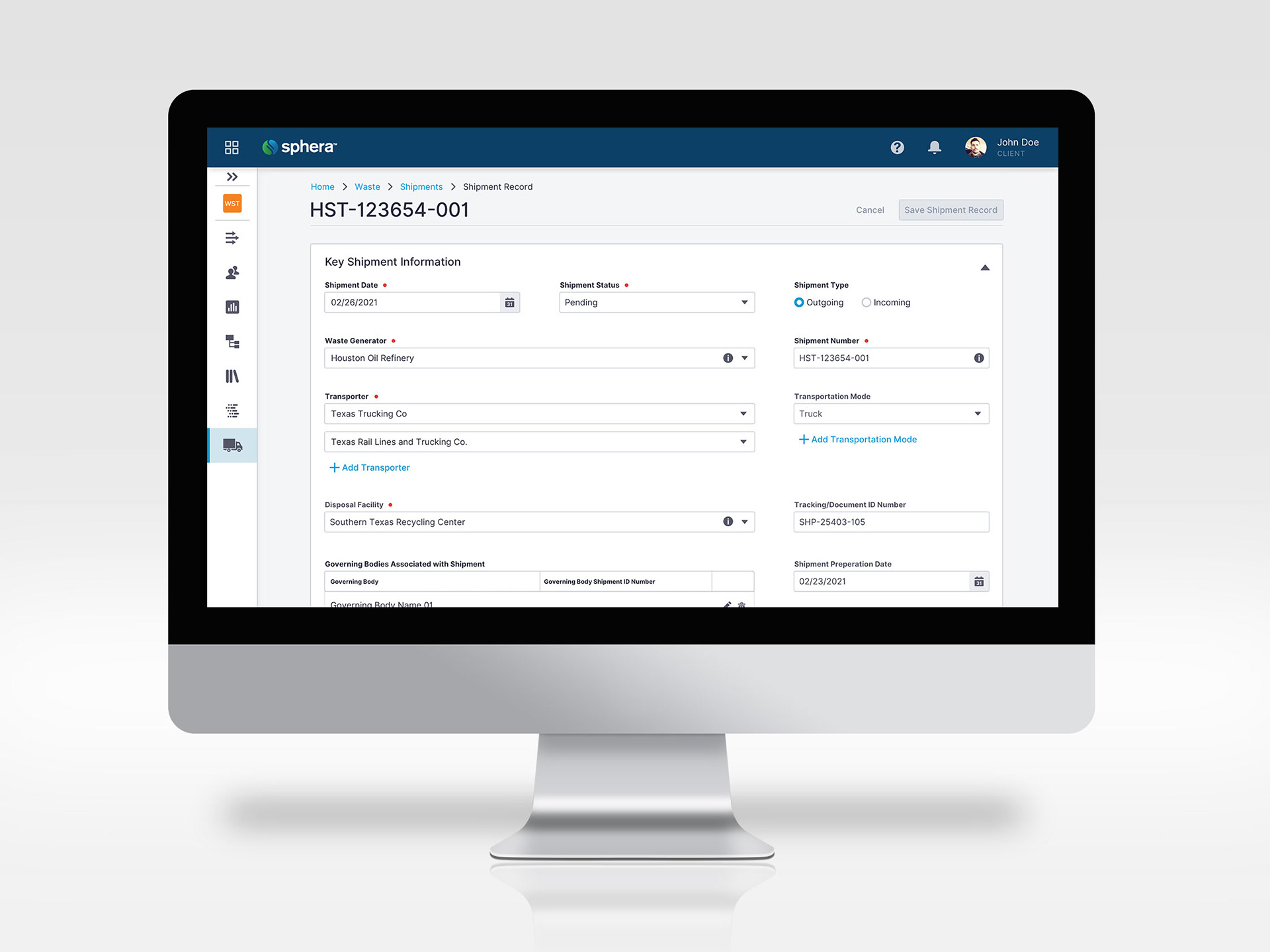 Next, our user wants to add a new shipment. By clicking the Add Shipment Record button on the Shipments page, our user is prompted to fill out a shipment form with information regarding the waste stream, waste generator, transporter company and transportation mode, governing bodies associated with the shipment (to help automatically determine if this shipment contains hazardous materials our not), and more. If our user has filled out all the necessary details in the previous sections, a lot of this information will auto-populate. Users will have the opportunity to override auto-generated information, but those fields should have simplify their experience.